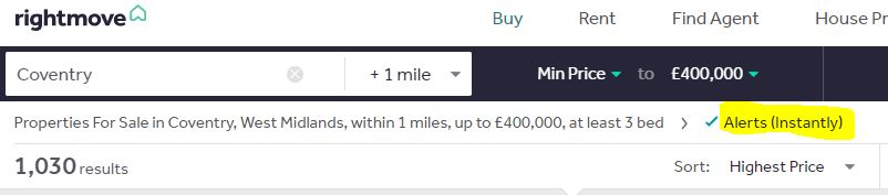 Have a look at the first page of results – are these the kinds of properties you want to buy, in the right location, at the right price? If they are, then use the ‘Alerts (Instantly)’ link next to the description, highlighted below, to set up an alert: