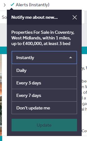 If you’re actively looking, you might want to select ‘Instantly’ (and then hit the ‘Update’ button). Or, if you know you won’t be checking your emails throughout the day, select ‘Daily’ and you’ll get one email a day when new properties are posted matching your criteria.